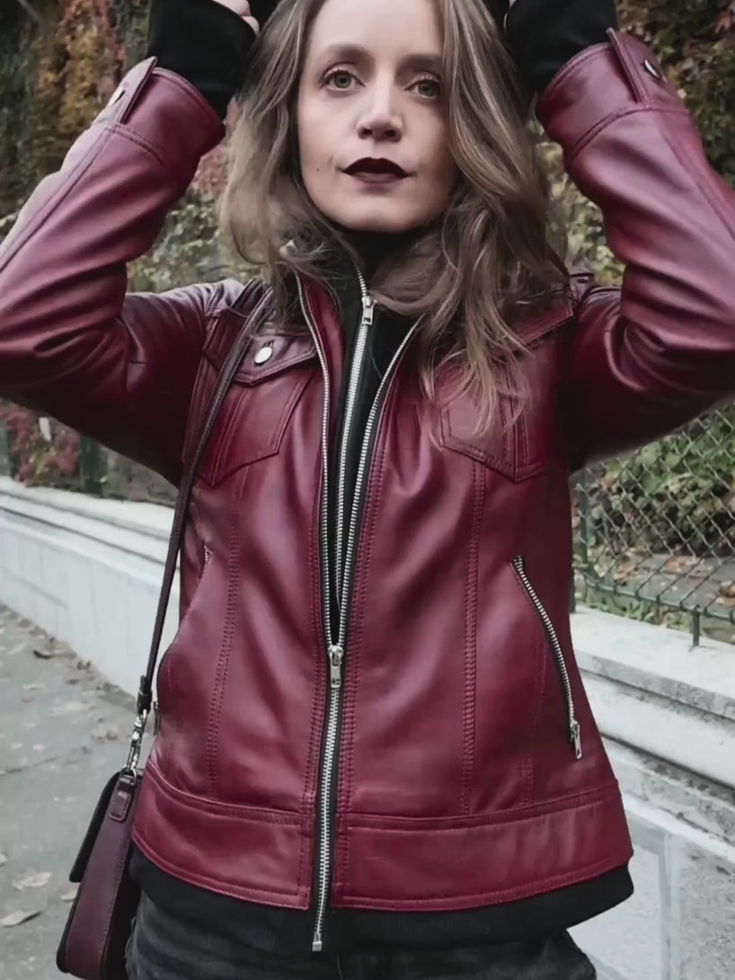 Women's Burgundy Leather Jacket with Hood